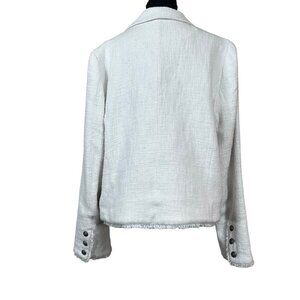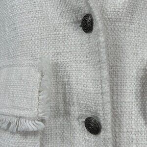 Elegant white blazer with textured fabric. Features button closure and front pockets. Perfect for formal occasions.