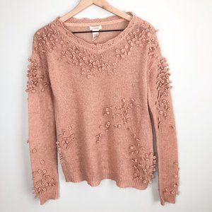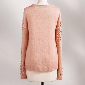 This uniquely pretty V-neck pullover sweater is soft and scattered with whimsical bobbles. Subtly flared sleeves and delicately scalloped, V-neckline. Beautiful light pink color.