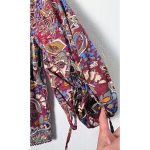 Sundance Women's Belladonna Beauty Cotton Top Ric Rac Trim Bubble Sleeves Tie Paisley Floral Print Bohemian Peasant Casual Burgundy Red Brown Blue Green