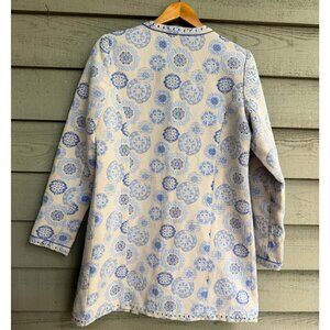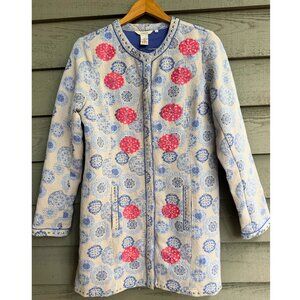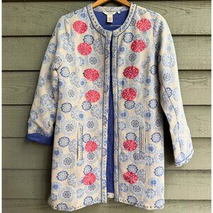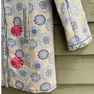 Stunning Sundance embroidered and beaded coat in size 6. This unique artisan-inspired piece features blue circular embroidered patterns with red floral accents, plus bead embellishments at collar, cuffs, and pockets. Button-front closure, cotton lining.