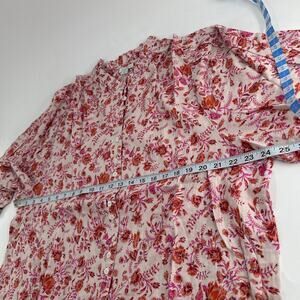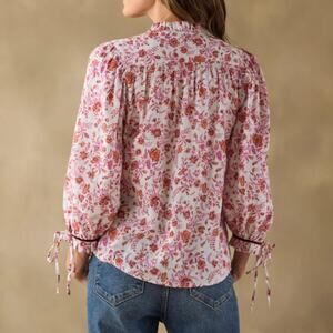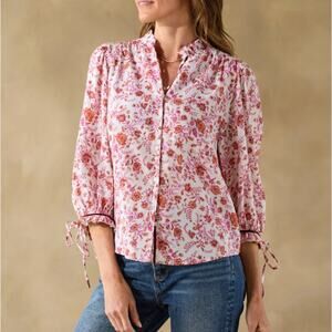 So easy—our feminine top is as beautiful as it is relaxed with button-down front, ruffle details at the neckline and bracelet length cuffs, contrast velvet trim and two lovely rows of smocking.
