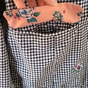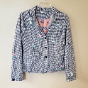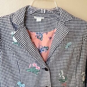 Like new Sundance womens Tansy gingham print floral embroidered blazer with 3 front buttons and pockets on both sides. Has pink floral lining inside the blazer, cuffs and pockets