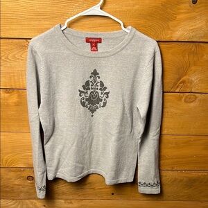 Stylish gray long sleeve top featuring a black decorative design on the front. Perfect for casual wear.