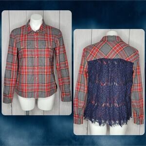 Sundance Wool Blend Button Up Shacket with Lace Panel, size 6 red and gray plaid wool blend long sleeve button closure lined on the inside at the front lace panel detail on the back...really super cute front pockets shacket shirt jacket trendy winter wear Measures: shoulder to shoulder - 16" pit to pit - 19" length - 21.5" in good pre-owned condition