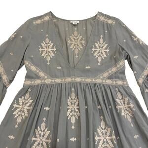 Capture the essence of bohemian charm with this Sundance embroidered peasant dress. Crafted in a soft muted slate blue with ivory embroidery, this dress features romantic bell sleeves, a flattering deep V-neckline, and gathered empire waist for effortless elegance. The breathable cotton-rayon blend and flowing silhouette make it ideal for any season.