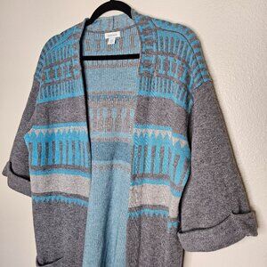Grey with blue stiripe detail. Long open front cardigan sweater. 2 pockets.