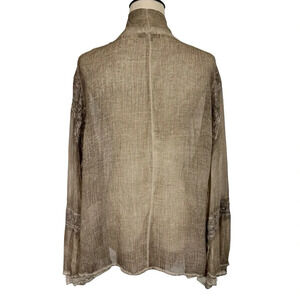 This lightweight layer is perfect for throwing over a top for a warm night or over a bathing suit. The fabric is a sheer gauzy type fabric with embroidered applique detailing and a waterfall open front.