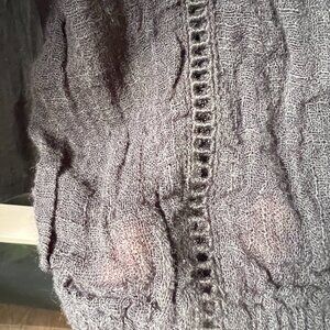 Airy top with lots of lovely textures, light cotton fabric with ladder lace, ruffle neckline, adjustable with cord with tassels ties, ruffle edges at the elastic cuffs. Cotton/viscose. Length from shoulder to hem appox. 29 inches. The stock photos in different colors are just for fit illustration. THE TOP IS BLACK.