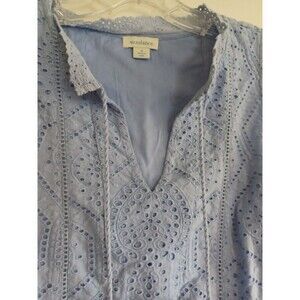 The Sundance blue eyelet cotton blouse in size S is a stylish and versatile piece perfect for casual occasions. This pullover tank blouse features tasseled accents, a solid light blue color, and a sleeveless design, making it a chic choice for summer, fall, and spring. Made from 100% cotton, this lightweight and breathable blouse is lined for added comfort. Whether you prefer a bohemian or preppy look, this blouse is sure to fit in with your personal style seamlessly.