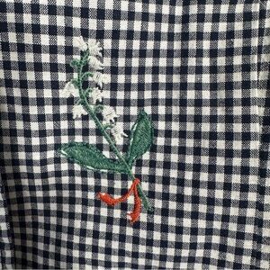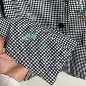 Adorable Tansy embroidered blazer from Sundance, sizne small. Classic gingham blazer with scattered floral embroidery; two welt pockets with flaps, adjustable back tab. Salmon colored floral lining. Cotton/linen blend. Three button closure in front.
