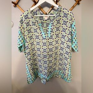 Sundance kaleidoscope floral silk boxy blouse. Has blue green and purple all over the blouse. Printed designs Size xl! I’m an xl so this is true to size. Measurements: sleeve:26; length: 26/28 high low hem; waist:24; chest:25