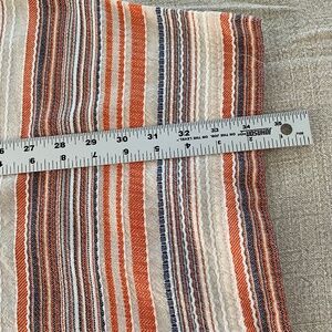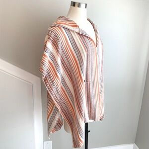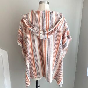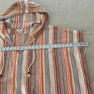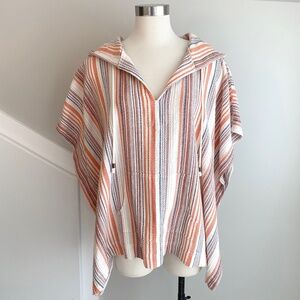 Very oversized baja-style hoodie poncho from Sundance in textured orange, blue and off-white cotton-blend woven fabric. Kangaroo pocket, beaded hoodie drawstring detail. Great over tanks/jean shorts in summer or as a beach cover-up. Very loose and flowy style. Excellent pre-owned condition, worn only a couple of times.