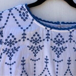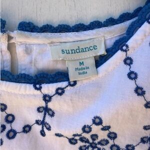 This Sundance blouse showcases a relaxed, boxy silhouette with charming ruffled accents, offering a stylish yet comfortable fit. The blue and white color palette provides a timeless appeal, while the 3/4 sleeves add versatility to your wardrobe. Made from a lightweight fabric, it ensures a breezy and effortless wear. Style: Palmera Top Color(s): White & Blue Item Details: Allover eyelet pattern Embroidered Keyhole back Three-quarter, ruffled sleeves Scalloped hem & sleeves Lined Condition: Excellent, pre-owned Material: Shell: 100% Cotton Lining: 100% Cotton Embroidery: 100% Polyester Sleeve 16” Pit to pit 19” Length 24 1/2”