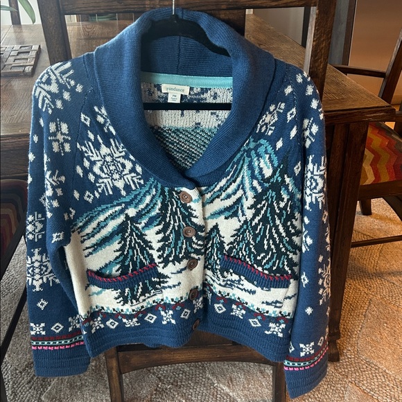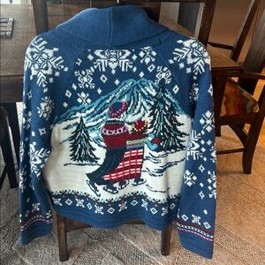 Charming navy cardigan with snowflake and tree patterns. Features wooden buttons and a cozy shawl collar.