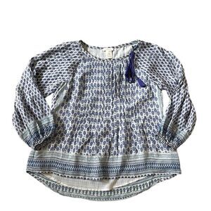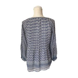 Sundance 100% Silk Bohemian Peasant Top. Features light and billowy silk with a mandala like pattern. Colors are gray, blue and purple. Tassels that tie on side of neckline. Full length sleeves with elastic wrists. Polyester lined. 100% silk. Hand wash or dry clean. Measurements in pictures.
