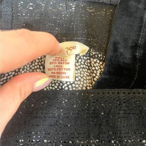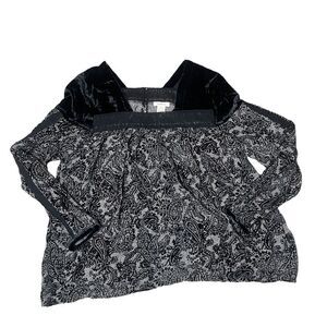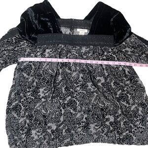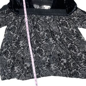 Sundance Velvet Burnout Boho Top. Features boxy Square neckline in velvet. Lace trim detain on front, back, and down sleeves. Black velvet shoulder panels. Velvet burnout body and sleeves are sheer.Velvet detail at buttoned cuffs. Rayon silk blend with cotton lace.