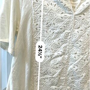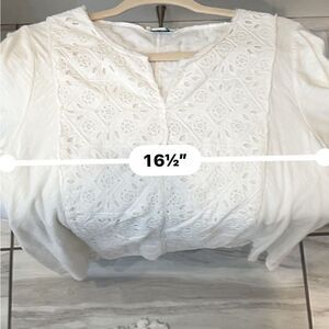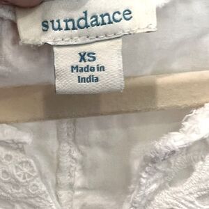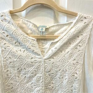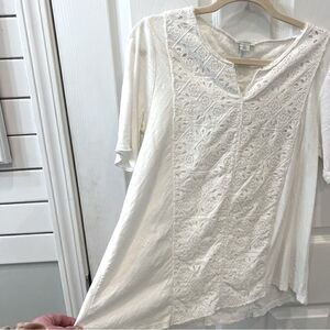 Sundance v-neck, flutter sleeve, white t shirt with eyelet embroidery overlay on front and back all the way from neckline to hemline Size XS