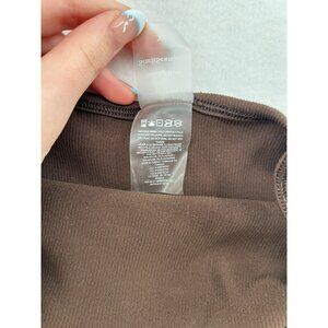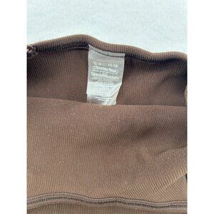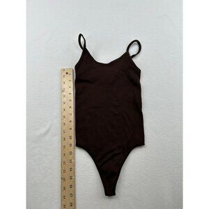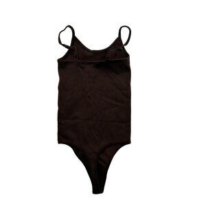 This versatile brown bodysuit features a ribbed texture and stretchy seamless design, offering a comfortable fit for layering or wearing on its own.
