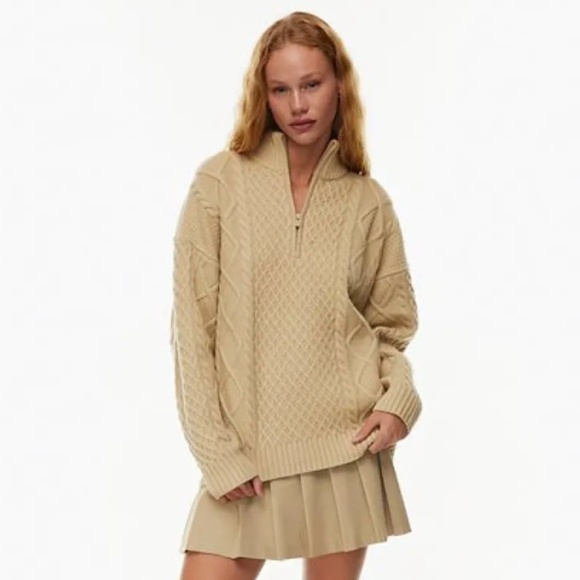 Elevate your wardrobe with this sophisticated 1/4-zip Aritzia Peggy sweater, featuring a sleek mock neckline and intricate Major Cable stitch design for a textured look and a convenient zip-up front. Crafted from a blend of extra-fine merino wool, recycled nylon, and organic cotton, it promises warmth and a luxuriously soft feel. Its responsible sourcing ensures both style and sustainability. The versatile tan color and intricate patterns make it a perfect addition to any wardrobe, offering both warmth and elegance.