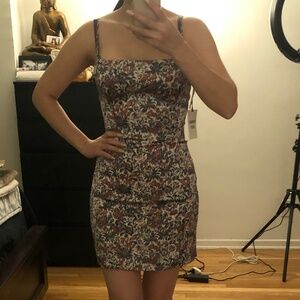This is a mini dress with a straight neckline and princess seams for shaping. It’s cut from lightweight stretch satin with a subtle sheen. This version comes in an exclusive floral print that was designed in-house. Sunday Best sold by Aritzia. Worn once for a wedding dinner rehearsal. Accepting reasonable offers :)