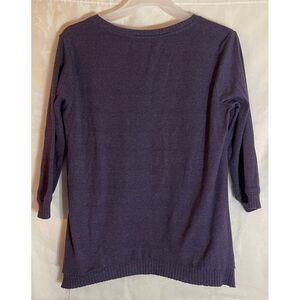 Versatile navy blue purple knit sweater with 3/4 sleeves and a relaxed fit. Features a classic crew neckline and ribbed trim details. Perfect for casual outings, office wear, or weekend brunches. The soft knit material offers comfort while maintaining a polished look. In good condition with minimal wear.