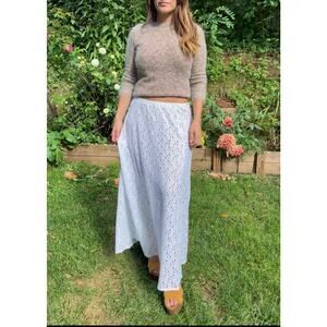 Romantic lace crochet is having a full revival — Chloé, Prada, and Nensi Dojaka have all put sheer layers and crochet details back on the map, now filtering straight into street style. This one is reworked from vintage fabrics into a one-of-a-kind Sunday Honey Original, cut with princess seams for movement and a hip-slung shape that feels equal parts bohemian and editorial. Linen waistband with side button closure makes it intentional, not costume. Styled here with nude boy shorts for an editorial vibe, but easily grounded with a simple slip for everyday wear.