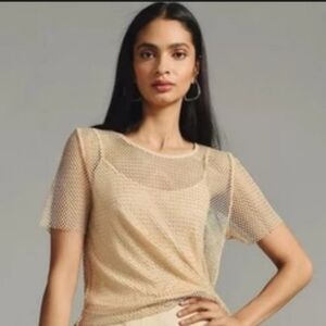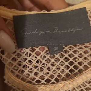 Sexy nude mesh top with rhinestone details. Perfect for layering. Comes with pale yellow/cream tank top for modesty option underneath. In perfect condition.