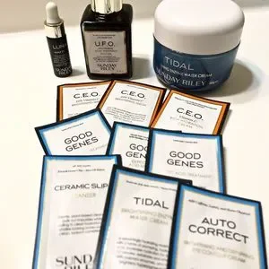 Full size unused U.F.O. face oil, mini Luna sleeping oil, 9 samples, & one full size (good batch) of Tidal that has been used a couple of times.