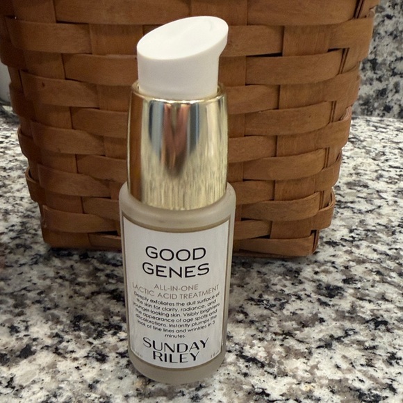 Sunday Riley Good Genes treatment. Features a sleek gold cap and white pump.