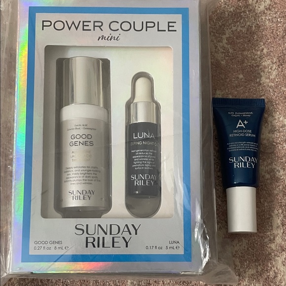 New. Elevate your skincare with Sunday Riley's Power Couple Mini Set. Includes Good Genes in white and Luna Oil in blue. Ideal for revitalizing your skin. Free Sunday Riley A+ sample.