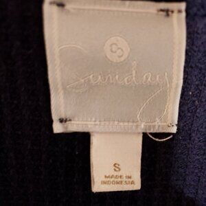 Sunday women’s navy waffle knit long sleeve open front cardigan small. Gently used condition. Measurements are: 23” sleeve, and 28” from shoulder to shortest part of hem.