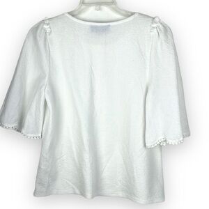 Sunday in Brooklyn Size Medium white textured stretchy top with eyelet edging and ruffle at shoulder with Flounce Short Sleeve