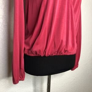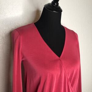 Sunday in Brooklyn pink faux wrap top. V neckline with faux wrap front. Long sleeves with elastic cuffs. Elastic hemline. Size XXSl. Good pre-owned condition. One small water spot on sleeve as shown. One tiny pinhole under arm as shown. Modal polyester spandex blend.