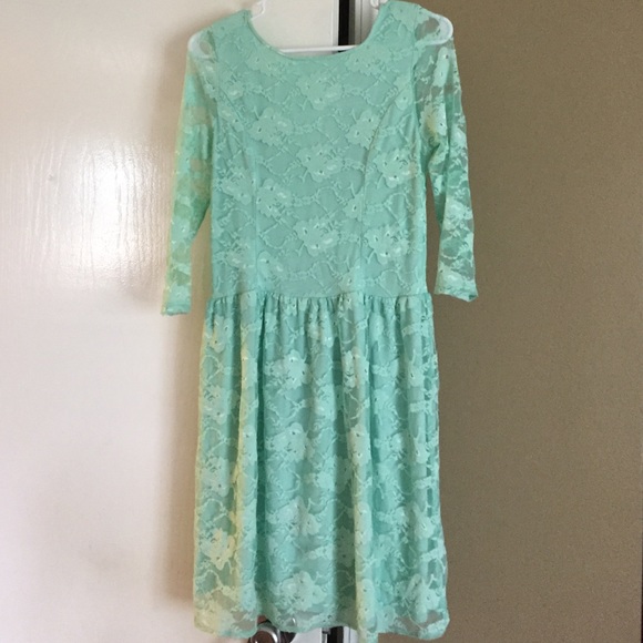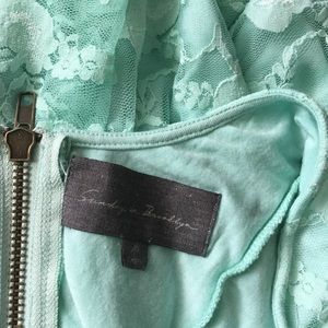 Sunday in Brooklyn Dress! Very romantic mint green lace dress! All but the arms are lined! Outside zipper in the back! Size M. 36 inches ling. Bust 16 inches measuring across the chest. Waist measuring across the front 15 inches. Very stretchy material! Rayon spandex blend! Great condition!