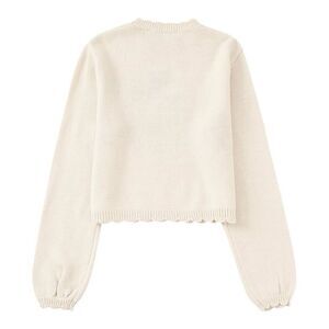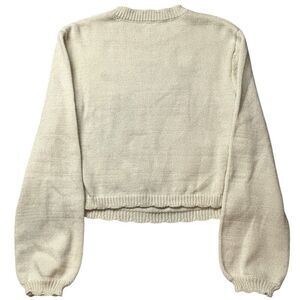 Missing fabric content and care tag. Get ready to channel your inner bunny with this SundayUp sweater! The ivory color and tight-knit polyester and cotton fabric make it perfect for any season, whether you're looking for a cozy winter layer or a lightweight summer sweater. The puff sleeves and scalloped hem add a touch of feminine charm, while the large graphic and cropped design make it a statement piece.
