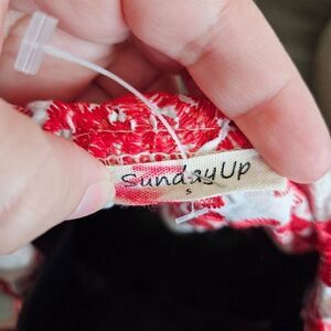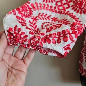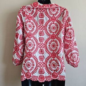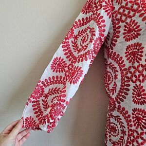 This is a red and white button up jacket by SundayUp. It has white pearl style buttons and red embroidery. The cuffs on each arm have elastic, and the hem is lightly scalloped.