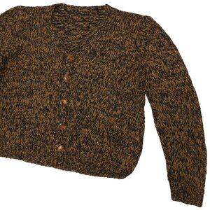 The chunky knit V-neck button-up cardigan is crafted from a marled wool-blend yarn, producing a textured and speckled effect that enhances its artisanal appeal. Designed with an oversized silhouette and a slightly cropped length, the relaxed aesthetic is further emphasized by its drop-shoulder construction and full-length sleeves. The large tortoiseshell-style buttons on the front closure complement the cardigan’s organic, rustic feel, reinforcing its heritage-inspired design. From a technical standpoint, this garment is classified as a handspun-effect marled knit cardigan, constructed using a fully-fashioned knit technique to ensure efficiency and reduce fabric waste. The primary stitch employed is stockinette stitch (RS knit, WS purl), with additional marled two-yarn knit techniques, alternating contrasting yarns in a twisted ply to create the distinctive speckled pattern. The 1x1 rib stitch is used for structural reinforcement at the hem, cuffs, and button placket.