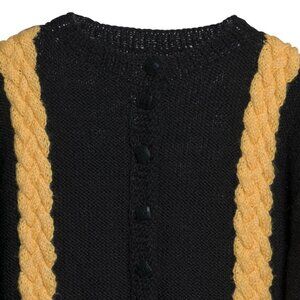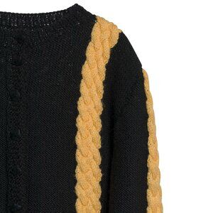 ...The handknit cardigan materializes as a structurally articulate, chromatically assertive knitwear artifact that reconceptualizes traditional cardigan typology through volumetric exaggeration, modular rhythm, and architectural knit logic. Constructed in a mid-to-heavy gauge wool or wool-blend yarn, its matte black stockinette base provides not only structural anchoring but also a neutral chromatic plane across which oversized canary-yellow braided cables assert a commanding visual and spatial presence. These vertically integrated cables—almost certainly produced via direct panel knitting rather than post-process applique—function not as decorative overlay but as axial interventions that partition the garment into chromatic and tactile segments, reframing the cardigan as a knit matrix governed by spatial syntax and compositional tension. This axial verticality transforms surface decoration into architectural language, aligning with the theatrical knit constructions of Vivetta and the sculptural exuberance of Mira Mikati and Tsumori Chisato, each of whom treats textile not as embellishment but as a primary vector of form generation. Simultaneously, the silhouette retains a traditional foundation—crew neckline, button-front placket, and drop-shoulder relaxation.