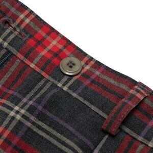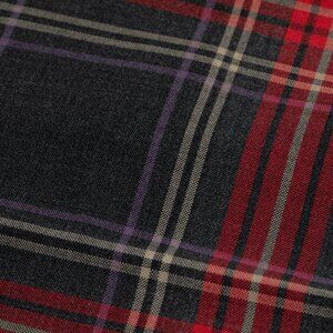 The tartan plaid trousers exemplify the intersection of heritage and modern tailoring, embodying both the historical weight of Scottish tartan traditions and the rebellious spirit of punk fashion. The trousers are crafted with a tailored mid-rise waist and a slim-straight fit, designed to bridge the divide between classic menswear and alternative styling. The cut is clean and precise, tapering subtly toward a structured, uncuffed hem. The tartan pattern, composed of red, black, purple, and beige hues, is strategically aligned across the seams, a testament to the garment’s meticulous construction. The historical significance of tartan as a textile is undeniable, dating back centuries as a marker of Scottish clan identity. In a contemporary context, tartan gained mainstream traction in the 1970s punk movement, spearheaded by designers like Vivienne Westwood and Malcolm McLaren, who repurposed the traditionally aristocratic pattern as a symbol of defiance. These trousers honor that lineage while modernizing it into a more refined, versatile silhouette. The fabric itself is a twill-weave tartan, characterized by its diagonal ribbing, which enhances both durability and drape. The interplay of colors within the plaid is achieved through an intricate weaving process that ensures consistency in pattern distribution.