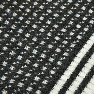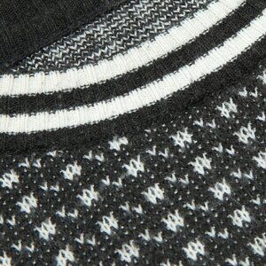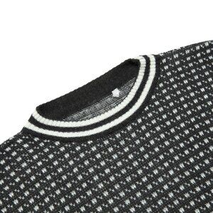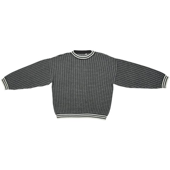 This black and white jacquard-knit crewneck sweater exhibits a structured form, tight weave, and a distinctive textural pattern reminiscent of traditional Fair Isle or Nordic-inspired knitting techniques. Balancing classic knitwear traditions with a slightly athletic or utilitarian aesthetic, the garment’s dense knitting and contrast ribbed trims at the neckline, hem, and cuffs reinforce its structured silhouette. The restrained monochromatic palette enhances its graphic precision, making it a highly versatile yet visually striking piece. The designer origin suggests mid-to-late 20th-century European or Japanese knitwear traditions, as the fabric choice, knitting style, and finishing techniques align with quality-driven manufacturing processes. The combination of a finely knitted base with ribbed contrast trims at the neckline, hem, and cuffs suggests inspiration from both heritage knitwear techniques and 1980s-1990s sportswear aesthetics. The black and white coloration reinforces a minimalist yet structured appeal, reminiscent of early designs by brands such as Comme des Garçons Homme or Yohji Yamamoto, both of which played with traditional knitwear techniques in a contemporary, often deconstructed, context.