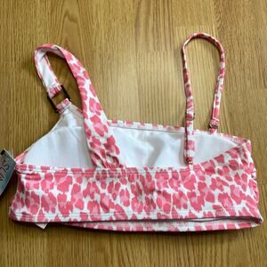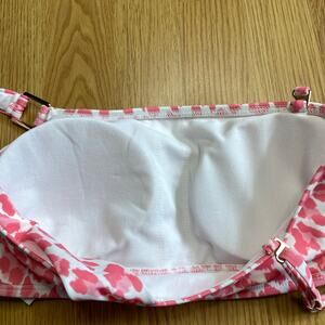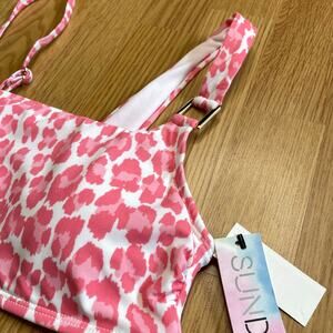 New with tags pink and white leopard print one shoulder top from Sundazed, size 32C. Bandeau swim top with removable soft cups, one shoulder strap with square metal connector detail plus optional second removable spaghetti strap.