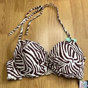 New with tags brown and white zebra print bikini top from Sundazed, 36C. Halter style straps with twist front and ruffle details along the edges, this makes a great neutral top to pair with a variety of bottoms. Underwire for support with bra sizing for confidence in the fit.