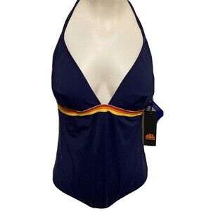 Backless Spaghetti Straps Triangle Top in Navy Blue with Retro Rainbow Yellow Orange Red Band. Removable Pads, Lined, and Back Logo. Specialty fabric with desirable features like UV sun protection, anti-pilling, protection from sun creams, chlorine, sunscreen, and oils. Soft Memory fabric made from recycled fiber, polyamide, and stretch elastane Tag Size EU 46