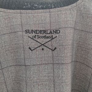 Golf shirt. Sunderland of Scotland. 28 inches long and chest measurement is 25. Has little pills of material on sleeves and the waist band noted in pictures.