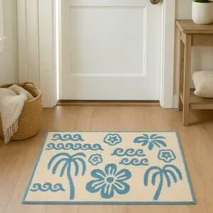 Bring a touch of the coast right to your doorstep with this breezy accent rug. Designed with ocean-inspired palms, rolling waves, and tropical blooms, it feels like a little slice of the shore underfoot. The soft yet durable weave is made for real life—welcoming sandy feet, salty air, and everyday comings and goings with ease. Place it in your entryway, bath, or favorite nook, and let its relaxed charm set the tone. Effortlessly coastal, perfectly practical, and just the right amount of lived-in cozy—this rug brings the beach home to you.
