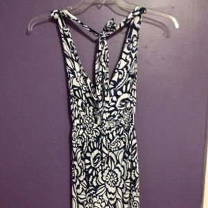 This is a sundress my sister gave me and I will be posting several more as soon as I can sort through them all. Even through I live in Kansas, I'm just not a sundress kind of girl. It's 100% rayon. In excellent condition. I've never worn it and I'm sure she wore it only once or twice. Navy and white. Ties at the neck with an open back. Very, very pretty. Size is XS.