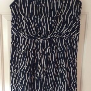 A blue and white sundress that is gently worn. Adjustable straps and zips with a hook in the back. Has a shear blue gown attached to the inside of the dress to prevent seeing through the dress. Slight loose threads around the hook in back of the dress.