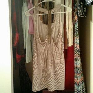 Tan and cream short patterned dress with tank top sleeves and zip up back.