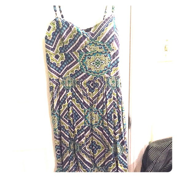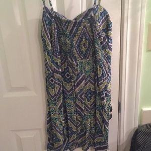 Cute sundress with a funky pattern. Used to have a belt; that’s why the strings are hanging off the side.