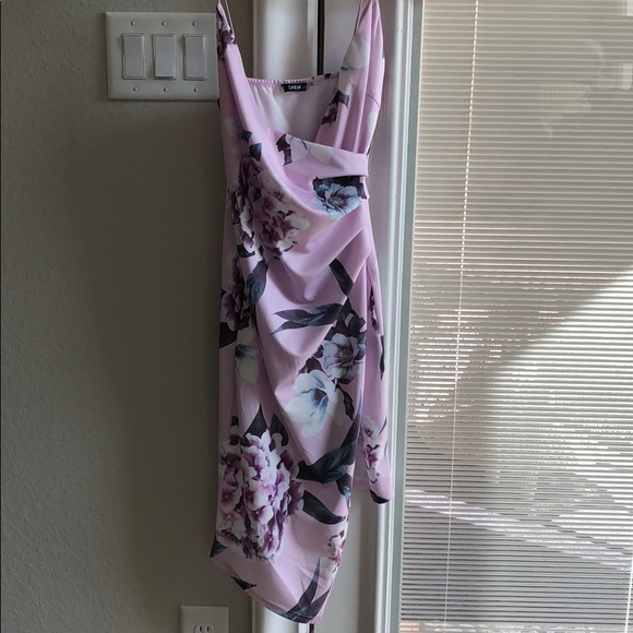 Side rouched . Side slit. Lavender floral spaghetti strap sundress